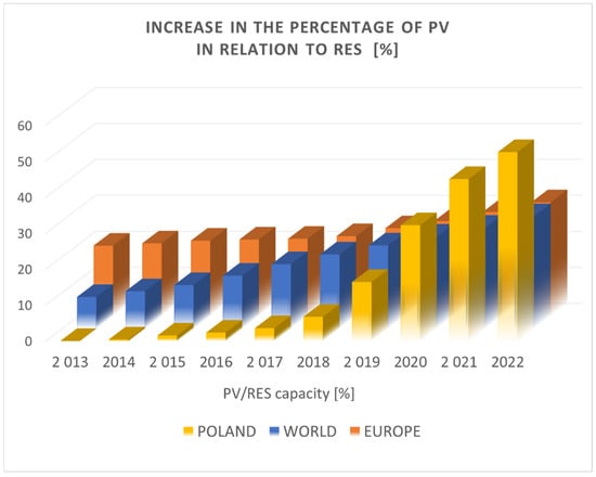 As can easily be seen, the development of photovoltaic-based energy systems is quite rapid (Figure 3). Figure 3 shows the growth in the share of installed PV systems compared with other RESs aggregated for the world, Europe, and Poland. The graph illustrates extremely large differences in the changes in the share of PV in the RES mix. In Europe, there is a stable value increasing over 10 years from 19.3% to 31.6%. In the global market, PV shares have increased much faster from a low of 8.8% to 31.2% (authors’ calculations based on [3]). In Poland, on the other hand, the increase is extremely high, ranging from 0.04% in 2013 to 52.5% in 2022. It should be noted here that, when compared with all solar energy sources in general, the global PV share is impressive, reaching over 99% in 2022, though it has been high for a long time and has increased over the last 10 years from 97.7% to 99.1%. The decisive factor for the great popularity of PV systems over photothermal conversion systems, despite the much lower energy conversion efficiency of PV systems, is their direct generation of electricity, which is easy to transmit and convert into other types of usable energy. Furthermore, the popularity of PV systems is strongly influenced by their ease of installation, virtually maintenance-free operation, and relatively low failure rate. They are therefore strongly promoted by individual and subsidised governments [5].