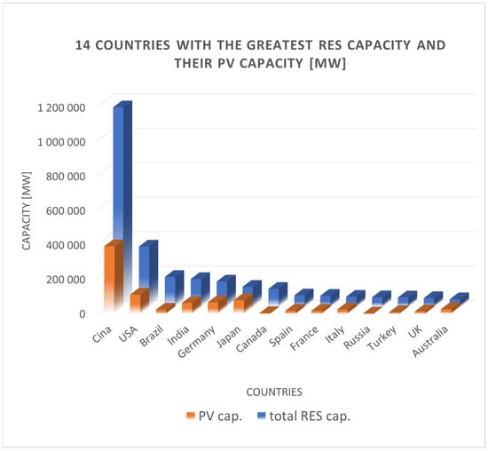 The rather strong increase in interest in PV installations observed in recent years has resulted in their incredible development both in terms of technology and the number of PV installations installed annually. Figure 4 shows the potential (installed capacity) of PV systems against the total potential in relation to the installed capacity of RESs for the countries most involved in RES generation. The leading countries in terms of total RES installation capacity in 2022 included Germany, the USA, Canada, France, Spain, Italy, UK, Brazil, Russia, Turkey, China, Japan, India, and Australia. However, not all of them are leaders in terms of installed PV capacity (Figure 4). This fact is generally due to two reasons. The first is geographical location, which limits access to large amounts of solar radiation throughout the year (Canada and Russia). The second is the wealth of these countries, as PV systems are not the cheapest RES. Here, Russia, Brazil, India, and Turkey are examples. It should be noted, however, that these countries obtain a significant part of their RES potential from simple biomass combustion.