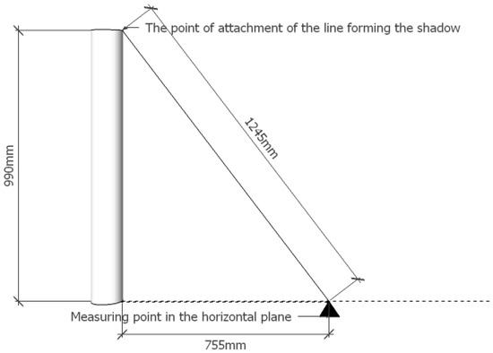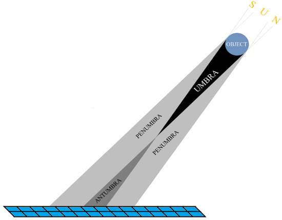 A diagram of the formation of the umbra, penumbra, and antumbra is shown in Figure 8. In Figure 8, the solar disc is not marked as, geometrically, it is infinitely far away, and the light rays coming from its specific points are parallel. However, the directions of the Sun’s rays defining the boundaries of the individual shading elements are marked. This figure shows a circular cross-section of a linear object creating shade.