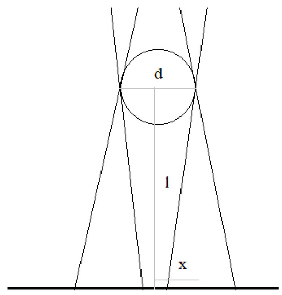 Diagram of the umbra and penumbra cast perpendicularly on the surface with the marked quantities d (rod diameter), l (distance of the object from the surface), and x (lateral distance from the shade axis).