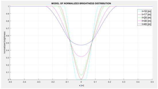 Examples of shading profiles for object diameter d = 0.15 (m) and selected distances l between the object and the projection screen.