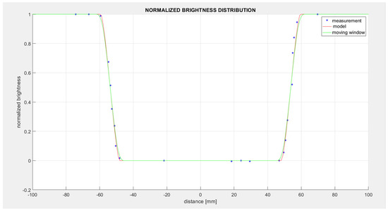 Measurements were made of the shade coming from a cylinder positioned vertically on a horizontal plane. A diagram of the location of the cylinder casting the shade is shown in Figure 13, and an actual view of the experimental stand is shown in Figure 14. Illumination measurements were made with a precision light meter sensor recording the light intensity, fitted with a 4 mm-wide linear aperture. The illumination profile was measured in a line perpendicular to the shadow line. The position of the sensor was determined using a digital ruler with a resolution of 0.01 mm. The results in the form of measurement points marked with blue asterisks are shown in Figure 15. The red line in this figure indicates the shading profile according to the model, while the green graph is a filtered red graph using a sliding window of 4 mm, which corresponds to the illumination recorded by the sensor. Thus, it is reasonable to compare the measured data with the red graph as well as the green graph, as can be seen in Figure 15.