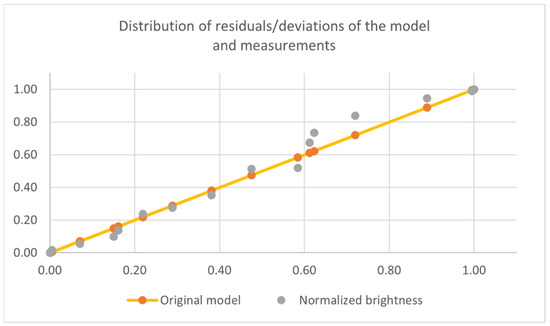 For the purposes of mathematical modelling, the shadow was assumed to have a brightness of zero, and the full illumination had a brightness of unity. Scaling equations (Equations (23) and (24)) were used: