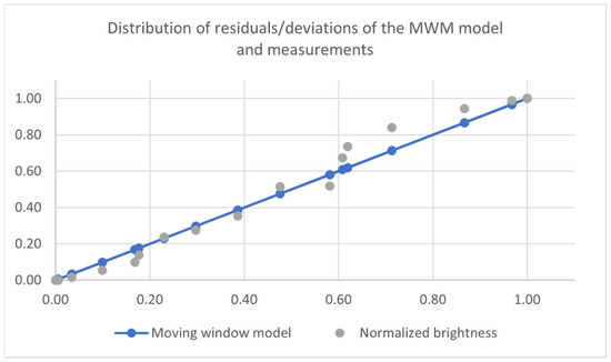 The results show that the model represented the measured data quite well (r = 0.09943, R2 = 0.9886). When the data were processed in the moving window model (MWM), the fit parameters decreased slightly (r = 0.994303, R2 = 0.988638). However, the fitting coefficient d, which is sensitive to the maximum deviation of the results and the model, increased, which was due to the “smoothing of the original model” by the MWM operation. On the basis of the results obtained, it can be concluded that it was quite well developed, and it was likely that the minimum discrepancies created were much more influenced by measurement errors than by the model not fitting.