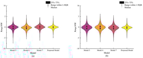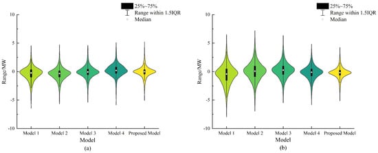 Figure 3. For Dataset I, the residuals of the proposed model are primarily concentrated between −0.428 MW and 0.353 MW, with a median of approximately −0.013 MW. For Dataset II, the residuals are mainly concentrated between −0.635 MW and 0.244 MW, with a median of around −0.186 MW. Compared to models 1 to 4, the proposed model’s residual distribution in both datasets is notably narrow and peaked, indicating that the residuals are closely clustered around the median. This suggests the stability and precision of the proposed model’s predictive performance. Furthermore, these findings demonstrate that the improved spatio-temporal graph prediction model with a dual-attention mechanism substantially enhances the prediction performance for regional distributed PV power stations.