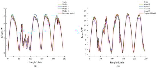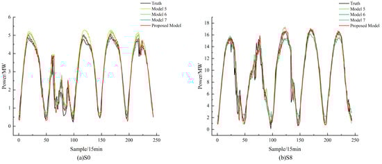 Figure 9a shows that, under complex weather conditions, the actual power values of PV station S0 on the second prediction day exhibit significant fluctuations during several periods. The proposed model achieves a high degree of fit with the actual values during these periods, demonstrating strong predictive performance. In contrast, models 5 to 7 show considerable deviations from the actual values in some periods, with overall smoother fluctuations in their curves. Similarly, as illustrated in