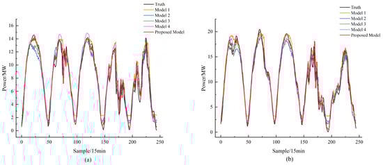 Figure 5a shows that both the proposed model and models 1 to 4 can effectively capture the actual power trends under complex weather conditions. However, examining the second prediction day of PV station S0 under complex weather conditions reveals that, despite some differences between the proposed model’s predictions and the actual values, the proposed model’s results are closer to the actual values compared to models 1 to 4. Furthermore, as illustrated in