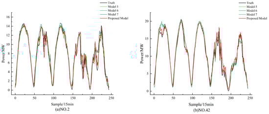 Figure 6, during the fourth and fifth prediction days for PV stations no. 2 and no. 42, the proposed model shows a better fitting trend, especially during the periods of local fluctuations, and its predictions are closer to the actual values in the trough periods. From the prediction results under complex weather conditions shown in