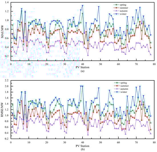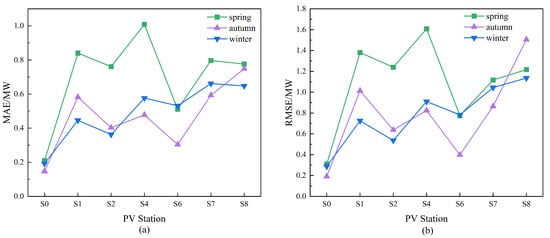 . Additionally, similar results were obtained in the experiments conducted in other seasons. This improvement is attributed to the ST-GCN network, which aggregates the feature information from highly correlated neighboring nodes, thus integrating features from multiple PV stations to obtain richer and more accurate feature representations. In contrast, model 1 predicts each PV station in the region individually, failing to capture the global information, which limits its prediction performance.