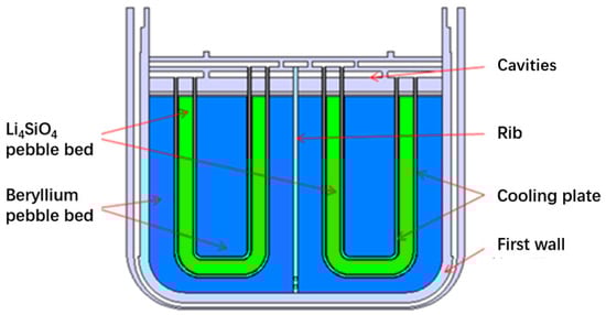 Figure 1. The TBM comprises a number of essential components, including the FW (faces the plasma directly, with cooling channels inside), rib (with tubes inside, connects the upper cooling cap and lower cooling cap), cavities for He coolant (provide room for coolant and distributing coolant to distinct tubes), cavities for purge gas (provide room for purge gas and distributing purge gas to distinct tubes), and the pebble bed regions (blue for the beryllium pebble bed region and green for the Li