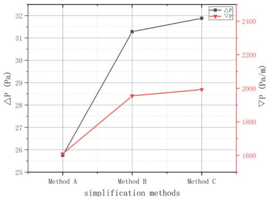 Pressure drop ΔP and its gradient in different simplification methods using SC arrangement.