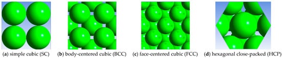 The second problem is the arrangement of the pebbles. In the realistic scenario, the pebbles are packed randomly. As this paper is focused on determining the parameters of porous media, the pebbles are arranged in the channel in a sequential manner in order to simplify the model and conserve the calculation resources. Four arrangements are employed widely, namely simple cubic (SC), body-centered cubic (BCC), face-centered cubic (FCC) and hexagonal close-packed (HCP), as displayed in