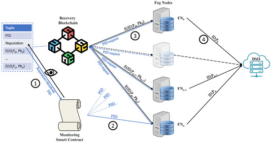 The user then sends a tuple containing each of these encrypted parts along with their pseudonym to the smart contract, which activates the pseudonym and stores the parts and pseudonym on the recovery blockchain. This way, no individual fog node can deanonymize the user. However, if deanonymization becomes necessary, the smart contract can make a request to the fog nodes to decrypt their parts and send them to the DSO. Fog nodes are semi-trusted, as in not trusted to not snoop, but trusted to cooperate (send the correct information) lest they lose their privileged status.