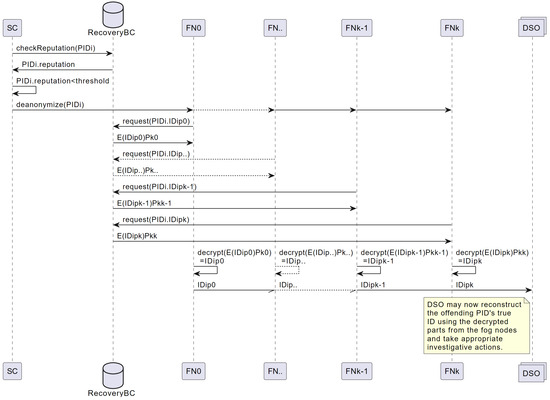 This creates a problem in situations where identification may be desirable. To amend this, a secondary blockchain (or separate storage on the main chain) is employed to store recovery information. Since information on the chain is public, it is mandatory that this recovery information be protected. Fog nodes are employed to encrypt and, when necessary, decrypt this recovery information. However, if the recovery information consisted of an encrypted ID and pseudonym pair, then an individual fog node would be able to deanonymize users. This reduces the privacy benefit that is being aimed to achieve.