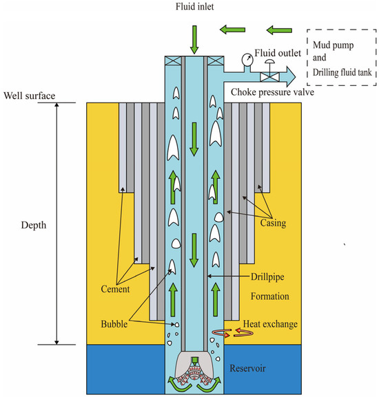 As shown in Figure 1, the drilling fluid exits through the drill bit nozzles and enters the wellbore annulus, carrying bottom-hole cuttings and gas–liquid mixtures back to the surface while exchanging heat with the formation in the annulus. To establish the geothermal wellbore model, the following assumptions are made: