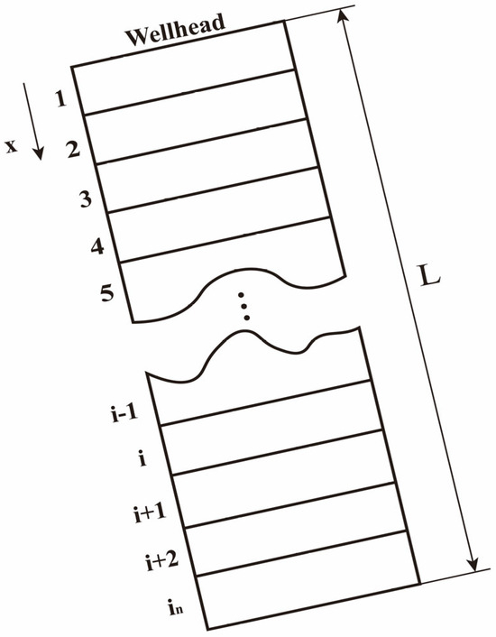 To accurately simulate the geothermal wellbore model, the wellbore is divided into in discrete grid cells along its length, with a total length of L and an increment of Δx for each segment (see Figure 2). Detailed calculations of pressure, temperature, velocity, and phase fractions are performed from the initial grid point at the wellhead, iterating down to the bottom of the well.