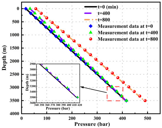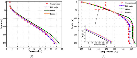 Figure 5 shows the pressure results calculated by Akbar’s model and Tonkin’s model. The mean relative errors (MREs) calculated by Akbar’s model at different time points are 2.036%, 2.035%, and 2.025%, while the MREs calculated by Tonkin’s model at different time points are 2.037%, 2.029%, and 2.029%.