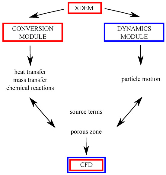 The XDEM method was developed by the team of Prof. Peters from Luxembourg University, and it aims at predicting the behavior of granular materials during various processes the particles undergo, e.g., oxidation, melting, mixing, or ash deposition [23,24,25,26,27,28,29,30,31,32]. The main assumption of numerical modeling is that each particle undergoes a sequence of thermodynamic processes described simultaneously by a set of one-dimensional and transient mass, momentum, and energy conservation equations using the Discrete Particle Method (DPM) to predict its motion [33,34]. XDEM is a numerical technique that practically extends the dynamics of particles described by the classical DEM and is used with commonly applied CFD for simulating flow through porous media (granular material as a group of particles). The main structure of the code is illustrated in Figure 1.