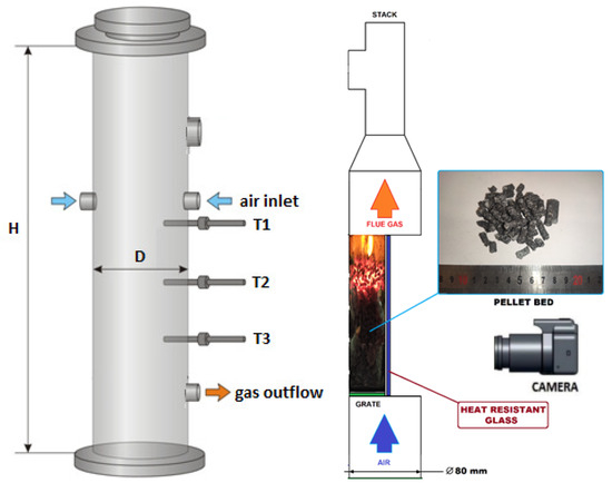 In this paper, small-scale reactors for biomass thermal conversion were taken into consideration while studying the process characteristics and analyzing the influence of the operational conditions on the products’ properties. In the IMP PAN laboratory, there were a few small-scale reactors for analyzing the pyrolysis and gasification processes. Most of them had a typical cylindrical shape (Figure 2—left scheme), but there was also one with a half-tube geometry (Figure 2—right scheme) [22,44,45]. The latter was taken into account in the numerical study for predicting the biomass behavior in a moving bed during heating, due to the possible influence of adjacent curvilinear and flat walls on the temperature profile propagation, as well as on the gas flow through the porous media in such a type of geometry. The reason for creating that untypical shape reactor was to have a visualization stand for reaction front propagation during the combustion of different types of biomass and waste fuels [46].