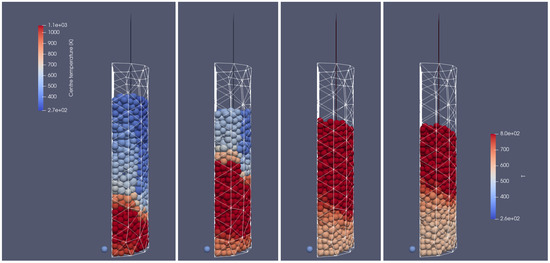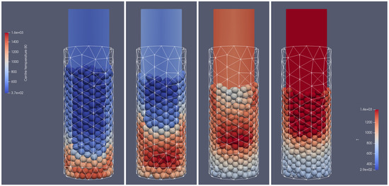 Figure 15 and Figure 16 illustrate the propagation of the heating front. The hot oxidizer flows into the reactor from the bottom heating the particle bed. Due to the oxidation reaction between the combustible gases, the temperature of exhaust gases increases. The visible change in the height of the bed can be observed as a result of the particles’ mass loss during their thermal conversion. Also, in this case, the influence of the reactor geometry on the heat and mass transfer is visible. The walls affect the flow through the porous media, i.e., the intensification of the heat transfer takes place in corners located near the back wall (see Figure 15 and Figure 16). The combustion front propagates to the top, and it is characterized by the parabolic shape function of distance from the reactor core.