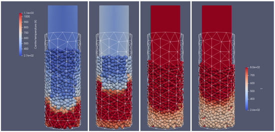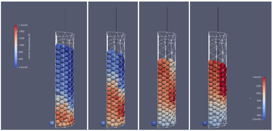 The next step was focused on the simulation of the bed of particles of different sizes. The geometry and the initial parameters for the computation were the same ( K, m/s). The random particle distribution was taken into account by varying the diameter of particles from 6 mm to almost 9.5 mm. This led to the filling of the reactor with 1652 biomass sphere particles. In Figure 14, the initial (left picture) and the final (right picture) position of particles in a fixed-bed reactor are shown. As can be observed, the height of the bed shrunk by 1/3 as a result of biomass particle mass and shape change.
