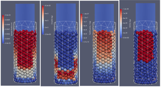 As can be observed in the case of same-size particles, the top particle (PID 510) is decomposed after 1400 s (see Figure 17—left graph), which for the whole bed gives the loss mass rate of 8.0 g/min. For the case with various sizes of particles, the top located particle (PID 1652) is transformed after the 1300 s (Figure 17—right graph) and it results in a whole bed loss mass rate at the value of 8.6 g/min. Those results are comparable with the experimental data obtained on the real test stand, which varied from 8.5 g/min to 15.8 g/min depending on the biomass type filling the reactor [44]. Thus, these primary numerical results are in good agreement with the lowest value as regards the total conversion time experimentally derived for the thermal treatment of biomass fuel in this particular reactor type. One should point out that if the combustion front propagates in the direction from the top to the bottom, i.e., the ignition takes place at the top part of the bed and it moves against the direction of airflow, the expected operational times needed to convert the biomass will, therefore, be extended [49].