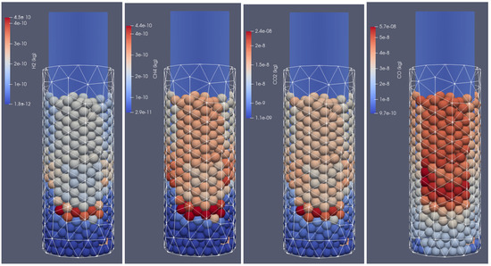 In Figure 19, the primary results for the simulation of the combustion of biomass particles in the air, but considering the ignition of the bed from its top, are presented. There, the ignition is realized by injecting the additional stream of hot gases supplied at the top. The combustion front in that case propagates from the top to the bottom of the reactor, which can be a good starting point for analyzing the different scenarios to predict the gasifier/combustion gas composition.
