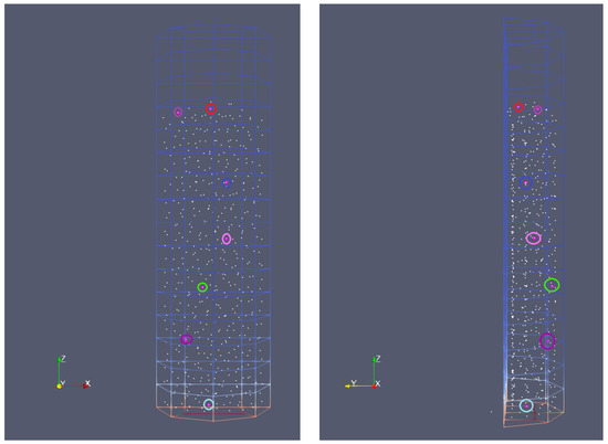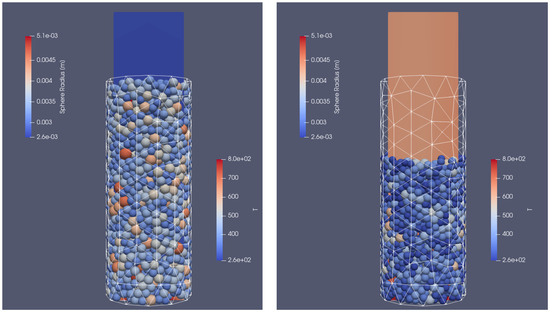 Two different cases were taken into account. In the first one, the container was filled with particles of the same diameter (), and in the other with particles of different sizes ranging from to . In each case, the particles were injected into the VECTOR reactor with a mass flow rate of 10 kg/s. The filling simulation time was set to 3 s and at the time of 1.3 s, the particle injection was stopped; following that, the particles were still moving due to the gravitational settling on the bottom side of the reactor. After reaching the end time of the simulations, the particles stopped sliding and their final position in the reactor could be defined. The cylinder was filled approximately with 510 biomass sphere particles in the case of a uniform size and with 1650 biomass particles of different sizes. This difference in the total number of grains can be seen in Figure 3. The results of calculations from the dynamic part of XDEM with the position of the particles were copied and served as an input file for coupled calculations with XDEM (conversion and dynamic module) and OpenFOAM. In the test case, it was decided to include the entire thermal processes taking place during particle thermal conversion, including heating, drying, devolatalization, and oxidation. The basic mathematical equations describing the mentioned stages are presented below.