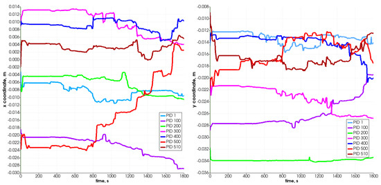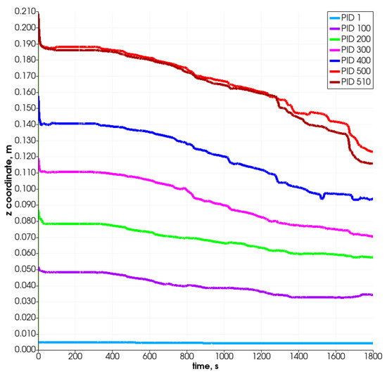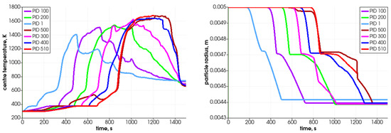 Analyzing the tabulated data, it can be observed that the particles that are located lower decompose faster, which results from the propagation of the temperature front. Moreover, the particles behave similarly, as can be concluded from the attached graphs depicting the time-variation parameters. Each curve is shifted in time, which is associated with the propagation of the temperature in the bed in the direction from the bottom of the reactor toward the top. The PID 500 particle, located at the top of the bed in the initial stage, behaves a little differently from the other particles. In this case, its decomposition time is prolonged (almost twice compared to the other analyzed particles), which is caused by the movement of this particular particle. Namely, during bed settling, this particle falls into a lower temperature area, so its temperature decreases (see Figure 11, time 650 s); therefore, the decomposition process is slowed down. This is in accordance with the previous authors’ analysis concerning the heating of particles in a variable temperature field [48].