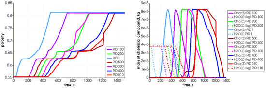 Due to solid fuel particle devolatilization and char production, the particle’s porosity increases (Figure 12 left graph). The dynamics of the pyrolysis gas generation is presented in Figure 13. It can be seen that the gases are released from the particle after water evaporation. , , and are produced in the first stage of the process, while is generated later.