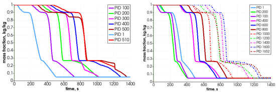 In Figure 17 and Figure 18, the particles’ mass loss in time are displayed. These graphs show the differences between two analyzed cases, i.e., the one with the uniform size of the particles (left graphs) and the second with the various particle sizes (right graphs). Analyzing the mass fraction parameter, it can be concluded that the bigger particles have to spend more time in the reactor for full conversion. Moreover, in the case of smaller particles (right-hand side), the operational conditions inside the reactor are much more unified, which makes the decomposition of particles more steady, i.e., the particles’ behavior is similar, and only the propagation of the heating front ensures that the initiation of their mass loss is shifted in time.