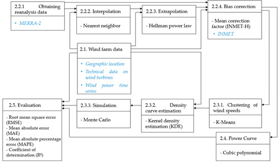 Section 2.1 presents the locations used to test the proposed method. Section 2.2 summarizes the steps employed in the predecessor contribution [29], which details steps 2.2.1 to 2.2.4. It discusses how to obtain and treat the wind speed reanalysis data from MERRA-2 for points in Brazilian territory to have data representing local reality and overcome the shortage of measured data points. We describe the main contributions of this article in Section 2.3.1, Section 2.3.2 and Section 2.3.3 regarding the wind power modeling and forecasting method. Section 2.4 presents a simple and widely adopted method to compare our proposal here against other methods used to relate wind speed and wind power generation. Finally, Section 2.5 offers the metrics adopted to evaluate the method.