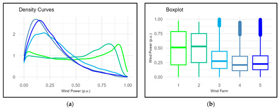 Figure 2 and Figure 3 depict the characteristics of the historical data on the active power of the wind farms. Power data are used p.u. (per unit), which consists of dividing the registered powers by the maximum power. This is carried out to make a fairer comparison between wind farms and the generation of different orders of magnitude. From Figure 2a, it can be noted that the probability density functions of each region are similar. The density curves of the wind farms on the coast are unimodal, with a top value near 10% of the installed capacity. In contrast, the density curves of the interior wind farms are bimodal, with peaks at the extremes. The power data from interior wind farms are more variable than those on the coast, and higher power values are also rarer due to the presence of outliers in their boxplots, as illustrated in Figure 2b.