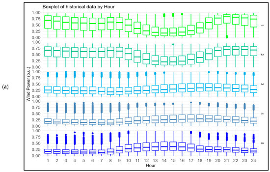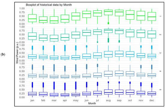 Figure 3 presents boxplots that indicate the generation variability during the different hours and months of operation. The wind farms in the interior have the lowest generation during the afternoon, while those located along the coast have highest generation during that period. Nevertheless, from a monthly standpoint, all the wind farms had higher generation during the year’s second half, with peaks in August and September.