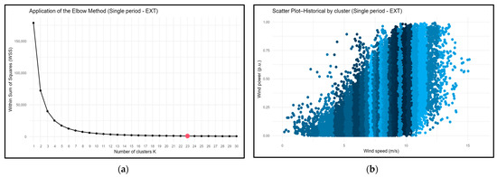 Figure 4 presents the result of applying the elbow method to Wind Farm 5 using a single period with extrapolated speed data (single-EXT) and a dispersion graph of the speed and power data. In the second graph, the different blue shades indicate the different wind speed clusters, permitting visualization of the variability in the power levels generated in each speed range. Corresponding graphs for the other farms and approaches are contained in the Supplementary Materials.