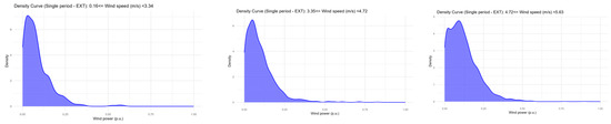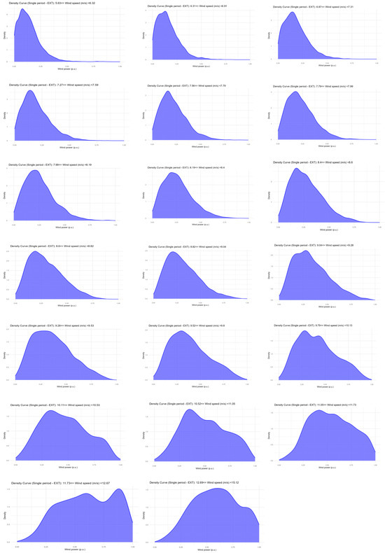 Then, KDE was applied to estimate the probability density function of the power values for each cluster resulting from the previous step. Figure 5 contains the PDF resulting from this step for each wind speed interval on Wind Farm 5 by the single-EXT approach. Note that as the wind speed values of the intervals increase, the peak of the density curve shifts toward the end of the interval. This behavior was seen for all the wind farms and approaches and was expected since faster wind speeds tend to generate more energy. Figures with the probability distributions of all the speed ranges for all the wind farms and approaches are shown in the Supplementary Materials.