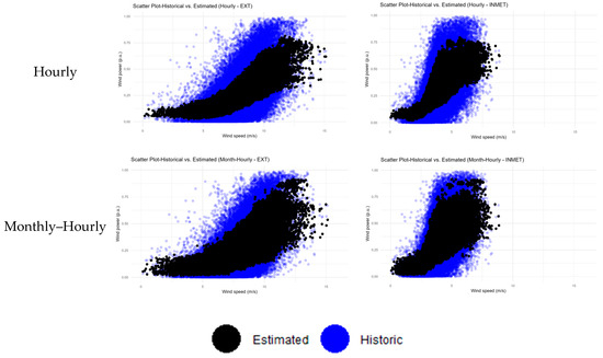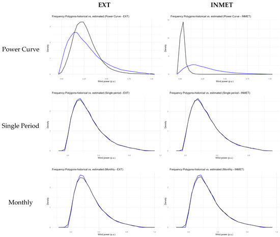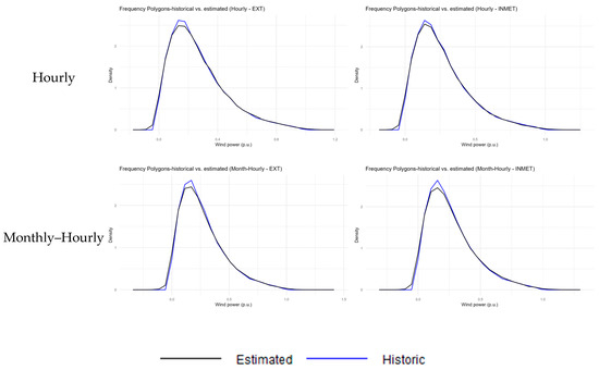 Figure 6 and Figure 7 compare the behavior of the wind farms’ historical data with the estimates resulting from each approach of the proposed method. The blue dots and lines in the graphs refer to historical data, while the black ones denote the estimated values. Figure 6 presents the dispersion graphs, evidencing the behavior of the power variable using the wind speed variable. From these graphs, it is possible to infer that the strategies described in this study managed to better replicate the inherent generation variability for the same speed values, with a highlight on the monthly–hourly proposal, which best captured the existing stochasticity. Figure 7 contains the frequency polygon graphs that estimate the density curve based on the frequencies of the power value intervals. Once again, it can be noted that the suggested strategies (single-period, monthly, hourly and monthly–hourly) replicate the power frequencies obtained from the historical data better than the cubic power curve.