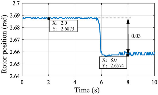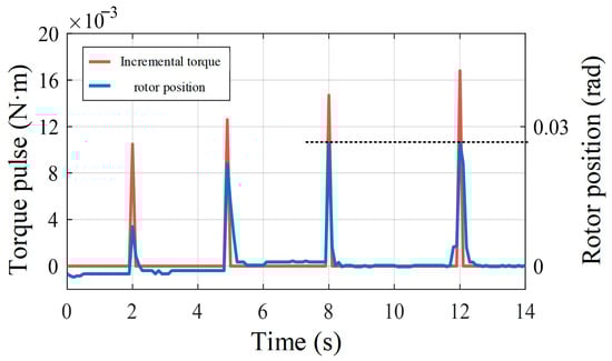 The experiment waveforms depicted in Figure 4 illustrate torque starting from 0.01 N·m, incrementing by 0.002 N·m iteratively. The dotted line displays the maximum value of rotor position. At a motor position of 0.027 rad, further increasing torque pulses yield negligible motor position changes. Thus, the identified gap amplitude is 0.027 rad, with a 10% identification error. However, this method faces challenges such as repetitive zero-point positioning, continuous trial and error of torque pulse amplitudes, and potential motion induction in the load.