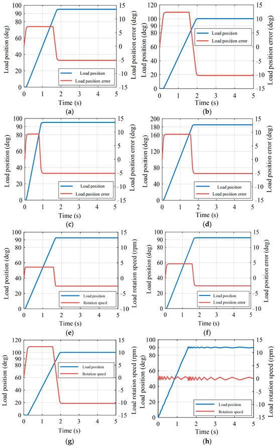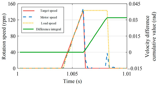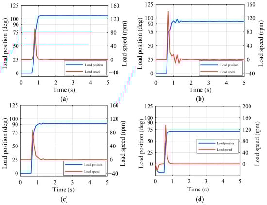 Figure 25 shows the dynamic response of the system at 20% of the rated load, and it can be seen that the state-feedback compensation strategy is also applicable for the loaded case. Compared to the no-load response shown in Figure 24b, loading stabilizes the system to a certain extent and the velocity shock is further reduced to 56.4 rpm, but this also results in a slower dynamic response at the load position.