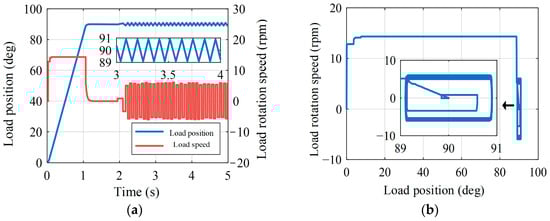 In fully closed-loop servo control, the load-side position sensor enables direct feedback, facilitating high-precision positioning control. However, mechanical transmission components with significant rotational inertia lower the system’s natural frequency, often masked by expanding control system bandwidth. Non-linear gaps on the axis can induce limit-cycle oscillations, as depicted in Figure 6a, showing load-side position and speed responses oscillating symmetrically around a specified position. Figure 6b illustrates phase trajectory waveforms winding into closed curves, indicating limit-cycle oscillations.