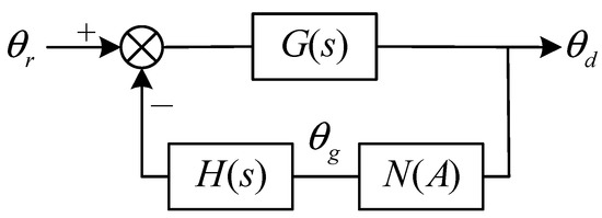 Triple-loop PI control is a prevalent method in industrial settings. In this control scheme, as depicted in Figure 7, the position loop utilizes proportional (P) control, while the velocity loop employs proportional-integral (PI) control. The current inner loop is simplified to unity. To facilitate describing function analysis, the control structure must undergo simplification into linear and nonlinear elements, as illustrated in Figure 8. Here, G(s) and H(s) represent linear elements, while N(A) signifies dead-zone nonlinearity. Additionally, θd denotes the difference between the drive-motor-side and the load-side positions, and θs represents the torque angle generating the transmission torque. Through derivation and classical nonlinear describing functions, the transfer function expressions can be derived.