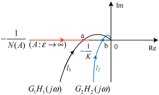 Variations in system stiffness ratios result in different limit-cycle frequencies. The earlier derived frequencies are based on necessary conditions for existence, but the absence of intersecting curves does not imply nonexistence. (7) shows that N(A) is a monotonic function, with its negative reciprocal range on the real axis from (∞, −1/K) when the limit value is substituted. In Figure 9, if the Nyquist curve of the linear portion is l1 and intersects at point a, a limit cycle exists; if it is l2 and its intersection point with the real axis lies outside the negative reciprocal range, further correction is required for the predicted frequency formula.