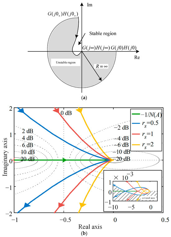 In the complex plane, the region bounded by G(jω)H(jω) delineates the unstable region, while the unbounded area denotes stability. Figure 10b illustrates the shaded region as the unstable region for rs = 0.5. According to the stability criterion for nonlinear systems: