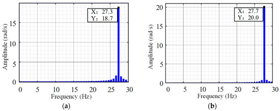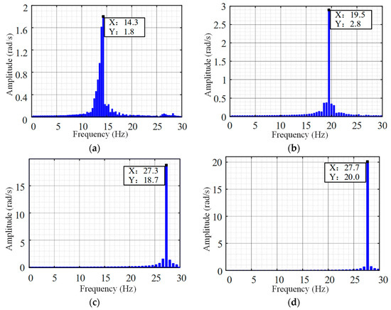 Figure 11b and Figure 12 display FFT analyses of load velocity at gap amplitudes of 0.02 rad, 0.04 rad, and 0.1 rad, respectively. Comparative examination reveals a consistent oscillation frequency of approximately 19.6 Hz across all three amplitude sets, signifying that those alterations in gap amplitude do not influence oscillation frequency within a stable oscillatory region. Furthermore, oscillation amplitudes were documented at 2.8, 5.8, and 14.6 rad/s, demonstrating a pattern of geometric proportionate growth consistent with theoretical analysis.