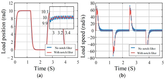 Load response of the system with gap using a notch filter: (a) load position; (b) load speed.