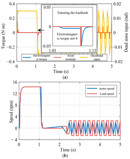 From the above FFT analysis, it can be seen that in addition to the limit-ring oscillation frequency, there are other harmonics at unpredictable frequencies, and an adaptive multi-frequency trap is required if the filter continues to be applied. In order to avoid complex design, the main reason for the formation of gap resonance is further considered: due to the dead band characteristics of the gap, the system axial torque changes abruptly to 0 in the tooth gap stage, while the electromagnetic torque remains constant, allowing the motor to continue to accelerate, which ultimately leads to impulses and oscillations, as shown in Figure 15. Therefore, reasonable compensation of electromagnetic torque is the key to solving the gap limit-ring oscillation.