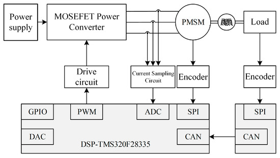 Figure 21 shows the block diagram of the hardware circuit structure of the dual-inertia servo system. The microprocessor is a Texas Instruments DSPTMS320F28335 chip, through the sampling module to get the motor three-phase current, according to the real-time position feedback from the AS5047P absolute encoder, calculate and update the duty cycle of the ePWM output to drive the motor rotation. The load-side controller is the same as the driver side, and the two transmit position signals in both directions through CAN communication.