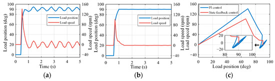 Figure 18 illustrates load position and velocity responses within a closed-loop control framework employing a dual-inertia system with backlash. Both PI control and state-feedback control were applied using identical simulation parameters. Notably, Figure 18b shows that state-feedback control effectively suppresses periodic oscillations, maintaining dynamic characteristics similar to those observed under PI control. This underscores the capacity of state-feedback control to mitigate limit-cycle resonance by strategically placing poles, consequently improving positioning accuracy.