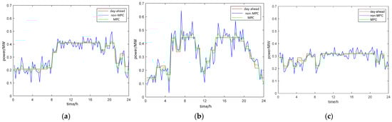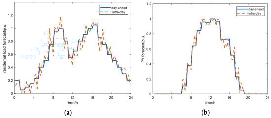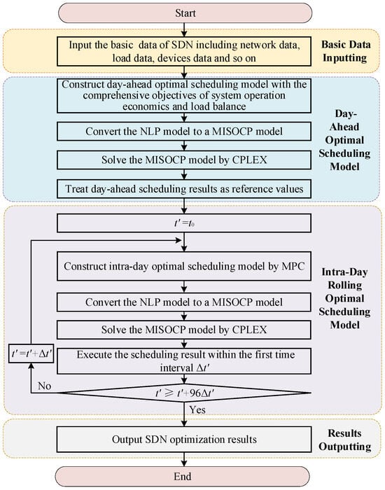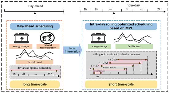 The increasing penetration of fluctuating renewable energy generation and fine-grained controllability of loads have redirected attention to online optimization methods on different time scales [23]. The penetration of distributed power sources and diversified loads has led to increased uncertainty in forecasting, with deviations between intra-day operating conditions and day-ahead forecasts. In order to correct the scheduling deviation caused by prediction deviations in a timely manner, the stochastic programming (SP) method, which is an effective uncertainty-tackling approach, can be applied. Diverse uncertainties from loads and renewable energy generation are handled by scenario-based multi-stage SP methods, which coordinate the day-ahead timescale and intra-day timescale [24,25,26,27]. Although the rolling optimization method can be adopted for the above method, it cannot fully meet the needs of online optimization adjustment in actual operation. The model predictive control (MPC) method, based on the idea of rolling optimization and feedback correction, can better adapt to the problem of uncertain predictions and has good robustness. MPC is widely used as a closed-loop optimization control means in the intra-day optimization operation phase [28,29,30,31,32,33,34]. Supply–demand balance can be met in the microgrid under complex uncertainties using MPC, and the output randomness of the exchanged power with the utility grid of the microgrid can be reduced [28,29,30]. MPC-based methods can coordinately utilize different controllable resources (e.g., ESSs, distributed generators) to effectively enhance the safety and economy of active distribution networks (ADNs) at multi-timescales, maximize accommodate renewable energy resources, and deal with multiple uncertainties [31,32,33,34].