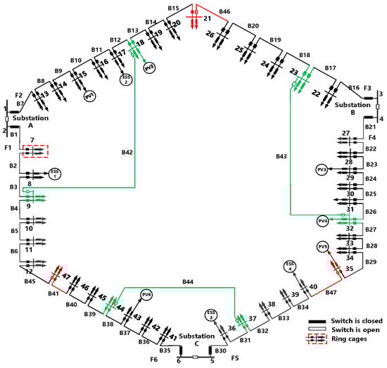 where CEXT, CESS, and CDR represent the cost of purchasing electricity, energy storage dispatching, and flexible load dispatching, respectively. CNR represents the switch action cost in the dynamic reconfiguration. ψEXT, ψESS, and ψDR represent the node sets of the loop network connected with the upper substation, energy storage, and flexible load, respectively. ψNR represents the set of branches that can participate in dynamic reconfiguration. λ(t) represents electricity price at time t. PEXT,i(t) represents the purchased electric power at moment t in ring node i. Δt represents the time step, which is 1 h. λESS represents the operating cost per unit of electricity for energy storage. PESS,ch,i(t) and PESS,dis,i(t) represent the charging and discharging power of energy storage in the day-ahead phase, respectively. λDR represents the reimbursement cost per unit of electricity for the curtailable load. PDR,i(t) represents the amount of load reduction at time t in ring node i. BNR represents the number of switching operations. λNR represents the cost of the switching operations. T is the total period of the time horizon, which is 24 h.